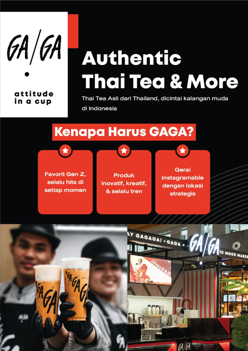 GAGA is a popular Thai bubble tea brand, founded in 2018, that emphasizes creativity, quality, and a unique "Attitude in a Cup" concept. Known for innovative menus featuring high-quality ingredients, fresh fruits, unique tea blends, and a variety of toppings, GAGA is a trend-leading vendor in the beverage market. The brand is well-loved for its signature Thai milk tea with mousse, flavorful options, and a focus on exceptional customer service.