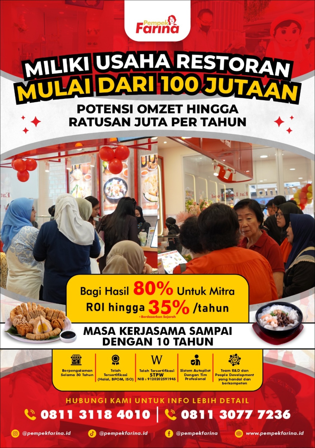 Bangun bisnis kuliner menjanjikan bersama Pempek Farina (sejak 1994). Investasi mulai 100 jutaan, bagi hasil hingga 80%, ROI hingga 35%. Full autopilot dengan support tim berpengalaman. Kunjungi booth kami di FLEI—kuota terbatas!